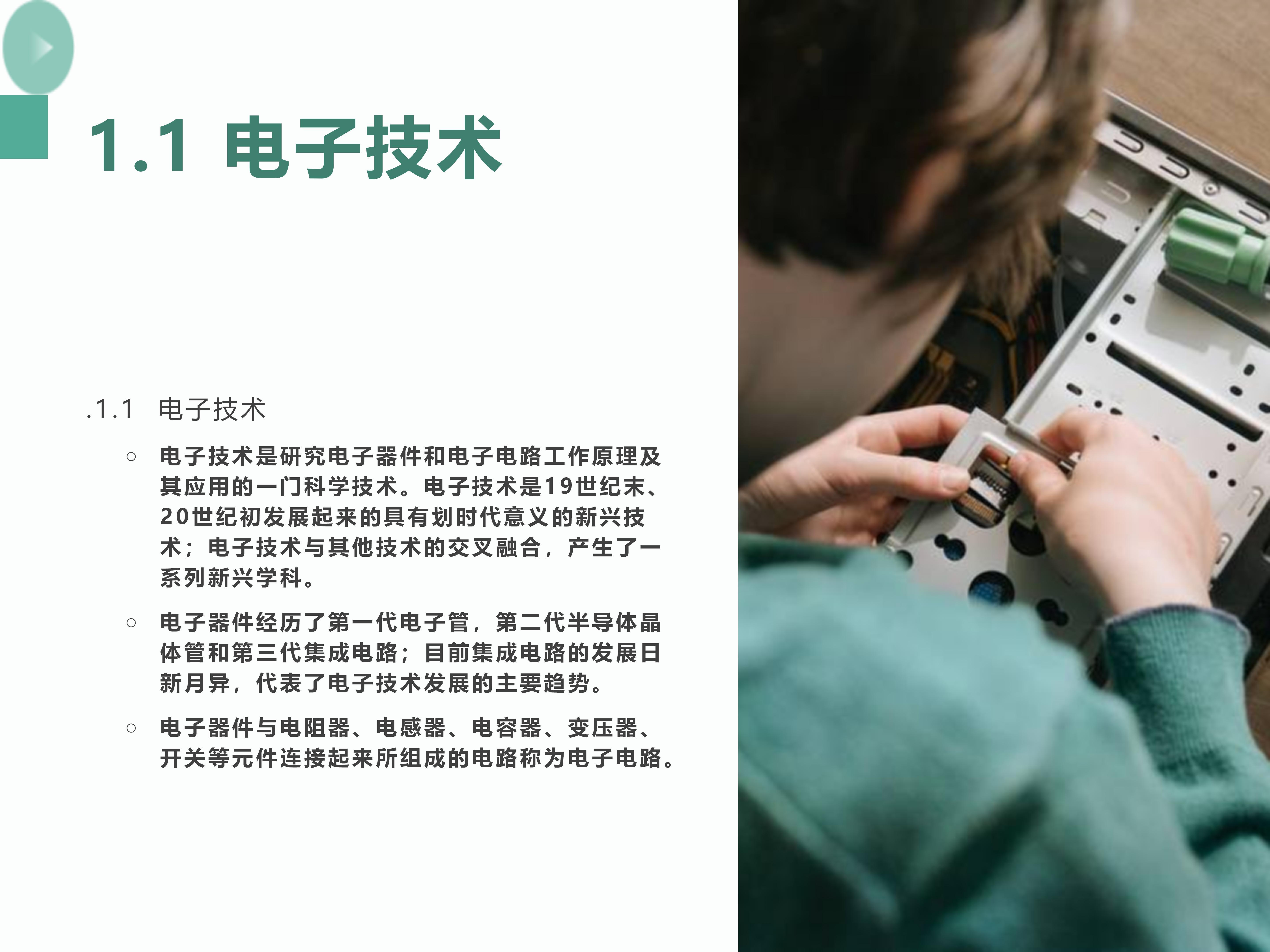 电子技术,主要指模拟电子技术和数字电子技术。在学模电和数电之前,你应该先学《电路分析》,注意,是《电路分析》,不是《电工》,电子专业不学《电工》与《机...