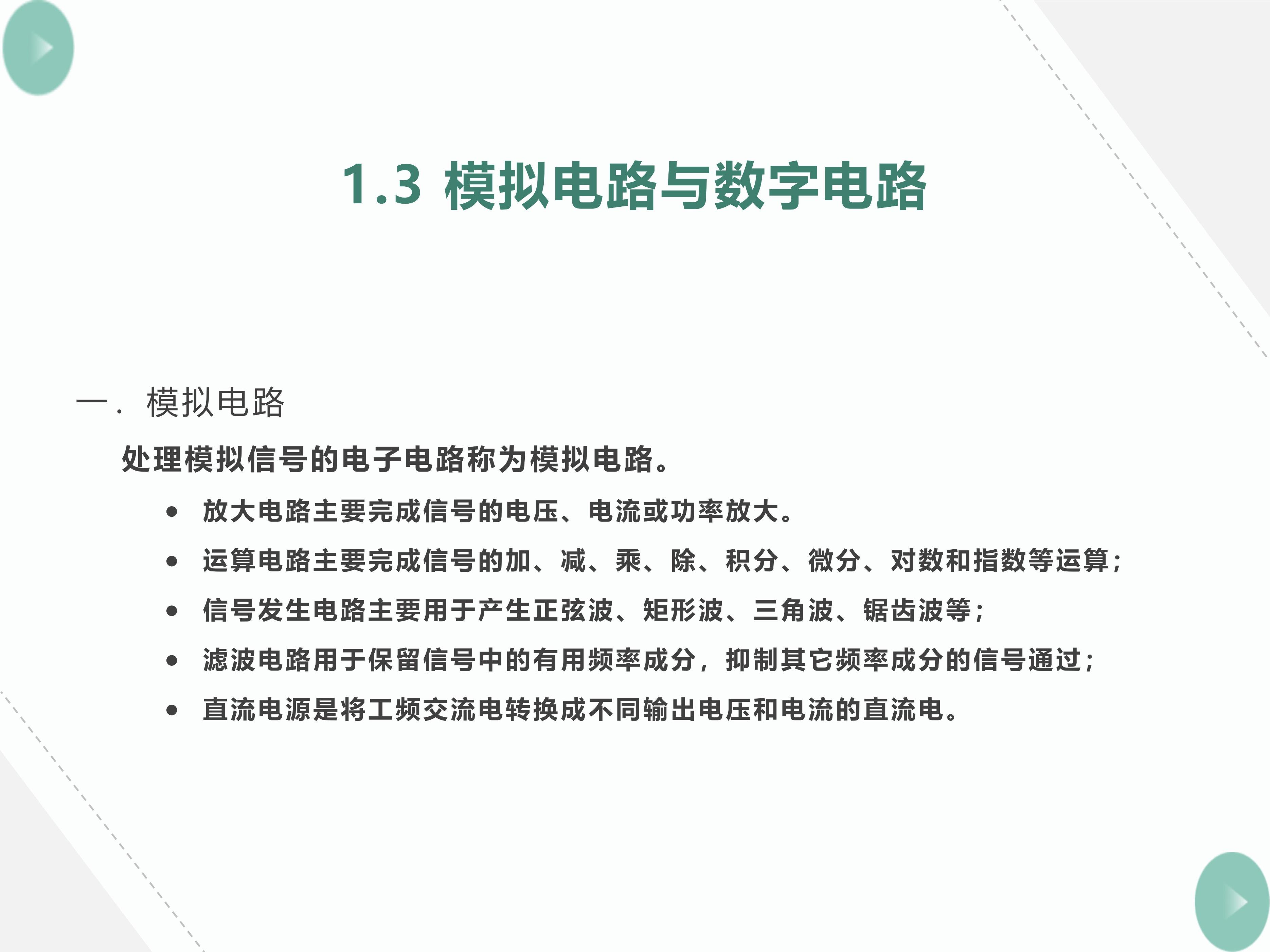 常见的模拟电路和功能如下:(1)放大电路:用于信号的电压、电流或功率放大。(2)滤波电路:用于信号的提取、变换或抗干扰。(3)运算电路:完成信号的比例...常...