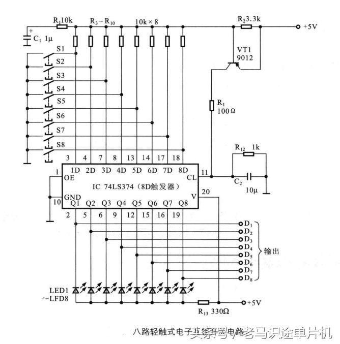 该电路由三态同相8位D触发器74LS374构成,S1-S8是8个轻触按钮开关,LED1-LED8为对应的开关状态指示灯。按下轻触开关中的一个,VT1基极将通过R3-R10中的某个电阻及所按开关连接到地,使C1放电,VT1导通,+5V电源经VT1和R11向C2充电,在IC1的11脚形成一个正脉冲,整形后送往各D触发器,由于所按下的开关对应的D端接地,且1脚为低电平,其对应的Q端也跳变为低电平并锁存。此时相应的LED点亮,并输出信号至功能选择电路。若下次再按动其它开关,电路将重复上述过程。