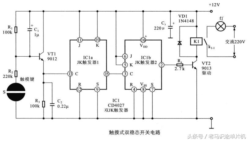 该电路采用一只JK触发器CD4027,这是一个双JK触发器,当人手接触到触摸按键时,触摸信号放大器VT1有输出信号,VT1的发射极输出的信号经两极JK触发器后,驱动VT2,VT2导通后继电器常开触点闭合,接通220V电压,灯被点亮。