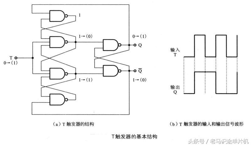 图a示电路结构示意图,图b是输入和输出信号的波形。由此可见,T触发器也是一个1/2分频电路。T端输入2个脉冲,而输出端则输出一个脉冲。