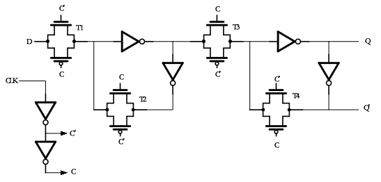如上图所示是COMOS集成电路中主要采用的边沿触发器电路结构,其实是用两个利用CMOS传输门组成的电平触发D触发器。