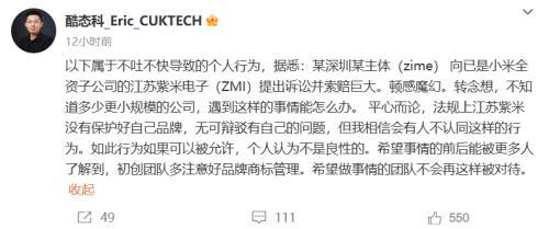 而在去年年底,小米子品牌 CUKTECH 酷态科市场 / 设计负责人 Eric 发微博声称:某深圳某主体(zime) 向小米全资子公司的江苏紫米电子(ZMI)提出诉讼并索赔巨大 。